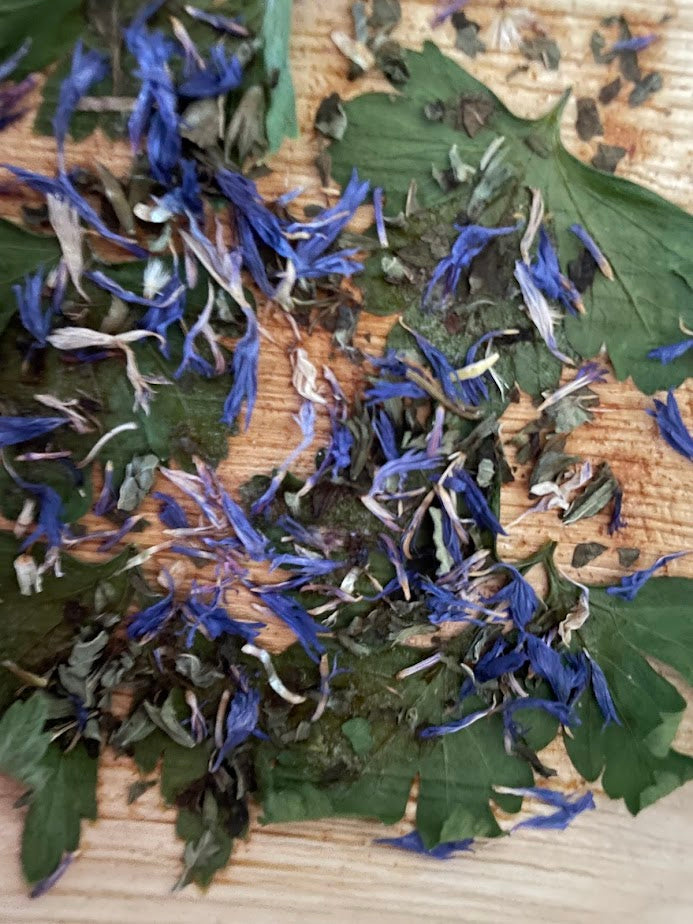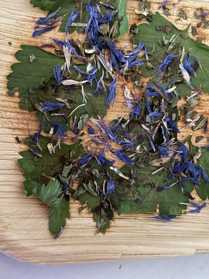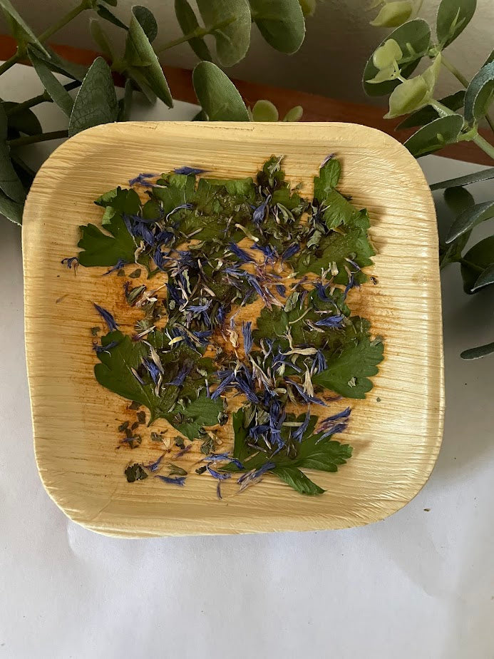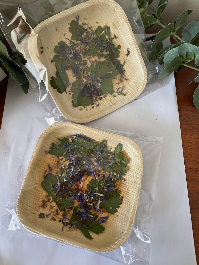 Palm leaf plate. With Banana glaze and embedded with parsley leaves and sprinkled with Lemon Balm and Cornflower petals.
